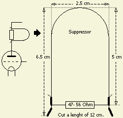 De smoorspoel (RFC) aan de anode is een verhaal apart. De minste problemen doen zich voor met een spoel in één laag. De warmteontwikkeling door infrarood straling van buizen is enorm en pertinax op twee centimeter afstand van een 4 × PL519 PA heeft bij mij vlam gevat. Ook hier is een hittebestendige spoelvorm aan te bevelen. Een forse, keramische draadgewonden weerstand, ontdaan van zijn draad, is een goede basis. Een diameter van 1.5–2 cm is voldoende. Wikkel de vorm over een lengte van 5–10 cm met 0.3–0.5 mm draad van een transformator. Meestal is dan de zelfinductie voldoende voor 80 m en hoger. Sluit begin en einde van de spoel kort («fig) en meet met een
