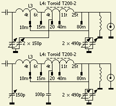 Hier werkt het als volgt: door de lage zelfinductie van de eerste spoel staat op 40 en 80 m de 150 pF condensator op de 20 m tap parallel aan de 150 pF tuning condensator. In het 10 – 20 m bereik staat dat parallel aan de loading condensator omdat het ongebruikte deel van de ringkern spoel wordt kortgesloten. Een enkelvoudige 150 pF condensator in combinatie met de getekende 100 pF op de 20 m tap werkt ook. Beide methoden sparen een tweede schakeldek voor de bandschakelaar uit.