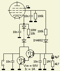 In dit schema wordt de weerstand overbrugd door een Darlington schakeling met twee transistors. Zodra het schermrooster door verviervoudiging een gelijkspanning krijgt, wordt de basis van T1 via een 100 k? met een spanning gevoed. De Darlington komt in geleiding en verbindt via een aantal in serie geschakelde diodes de kathode met massa. De buis gaat "open" om vermogen te leveren. Als de versterker geen sturing heeft loopt er dus geen rust en anodestroom. De in doorlaatrichting geschakelde diodes vormen samen een zenerdiode voor de ruststroom instelling van de buis. Door het indrukken van de schakelaar wordt tijdelijk de Darlington kortgesloten en kan men met een aantal diodes experimenteren om een geschikte ruststroom te verkrijgen. De componenten aan de basis van de eerste transistor zorgen voor een geschikte RC tijd om een soepele werking van de schakeling te garanderen. De aanspreek en afvaltijd van de schakeling is mijn persoonlijke keus. U kunt met andere waarden experimenteren of het netwerkje met 1 M?, 4.7 k? en 4.7 µF weglaten en een eenvoudiger schakeling bouwen dat verder in dit artikel staat.