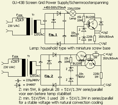 Verder worden aan een voeding van het schermrooster de volgende eisen gesteld: bescherming tegen vonkoverslag (flash over) in de buis en in staat om negatieve roosterstroom te verwerken. De meeste serie voedingen voldoen niet aan alle genoemde voorwaarden. Er werden een veel (ook schakelende eigen ontwerpen) getest voor een goede schermrooster voeding. Van eenvoudig tot complex met allerlei beveiligingen. Ten slotte ontwikkelde zich een simpele parallel voeding (fig»).