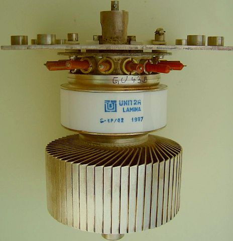 De afstand van anode tot gloeidraad aansluiting is bij sommige GU-43B's te kort voor de getoonde keramische schoorsteen.