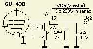 Flash-overs komen vrij regelmatig voor bij deze en andere keramische buizen, vooral als ze lange tijd niet in bedrijf zijn geweest. Bij zo'n gebeurtenis kan ook kortstondig de volledige anodespanning op het rooster belanden. Ter bescherming van het rooster staat parallel eraan een beveiliging tegen overspanning in de vorm van een («fig) varistor, surge arrestor, VDR, of hoe die dingen ook nog meer heten. Er lagen hier nog een aantal uit gesoldeerde 230 VAC types en er werden twee in serie gemonteerd. Dat bleek tijdens het experimenteren een goede preventieve maatregel te zijn om beschadiging te voorkomen. Je doet soms iets stom en dan knetteren er vonkjes tussen de elektroden zodat je weet dat er iets mis gaat.