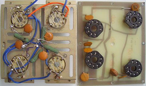 Alle foto's geven een indruk van een mogelijke opstelling van de belangrijkste componenten. Het beste kunt u eerst gaten voor de vier buisvoeten in een glasvezel printplaat maken. Vervolgens de voeten bevestigen, daarna onder aan de koperzijde kathodeweerstanden, ontkoppel condensatoren en 4 ÷ 1 trafo monteren en vervolgens de aardverbindingen met het koperoppervlak maken. Uit HF oogpunt is het gewenst om de printpaat met b.v. isolerende afstandsbusjes aan het chassis te bevestigen. De plaat heeft dan maar op twee plaatsen HF contact met het chassis, respectievelijk aan de ene kant via een coaxkabel naar de ingangsschakeling en aan de andere kant naar het aardpunt van de afstemcondensator.