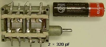 De 1100 pF loading condensator («fig ware grootte) kan een kleine drievoudige luchtcondensator met vrij kleine afstand tussen de platen zijn. Zij hebben vaak een vertraging en een potmeter voor FM afstemming en zijn gebruikt in (transistor) AM/FM radio's. Je hebt ze ook in een tweevoudige uitvoering, maar dan moet er op 40 en 80 m een extra capaciteit aan parallel geschakeld worden. De 350 pF tuning condensator kan een meervoudig type zijn, dat vroeger in oude buizen LG/MG ontvangers gebruikt werd. Ik zie ze nog regelmatig op vlooienmarkten. Vuil, maar met onder andere Biotex zijn ze te reinigen en worden dan veelal weer "nieuw". Ook een behandeling in de vaatwasser doet het meestal goed.