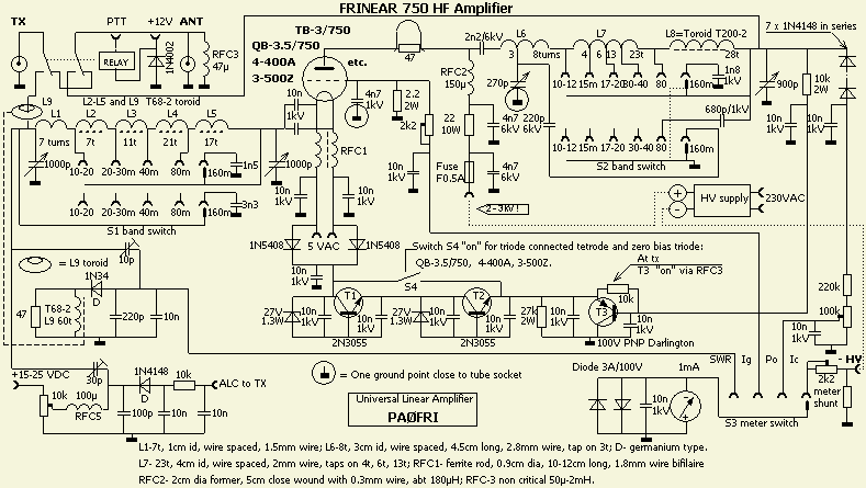 The lower diagram was for the rebuilt amplifier using a single TB3/750 triode. Some features may be of interest and encourage other experimenters tackling a high-power linear: