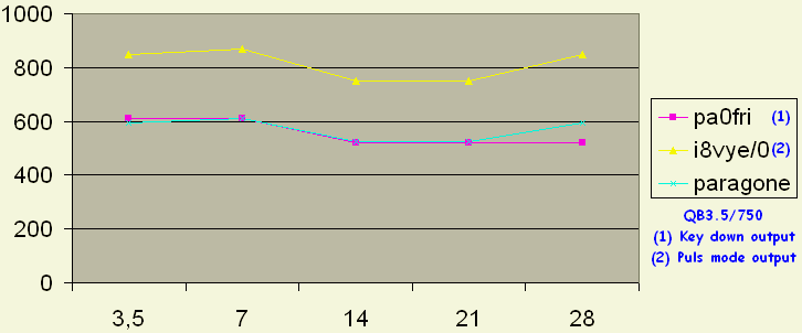 Joe, I8VYE/0 has homebrewed this design with a QB3.5/750 and with a pulser system in the CW mode he measured the PEP output with a calibrated Bird 4381 power meter (max. hold) and two different set of slugs. Both types gave the same result. On all bands 10–80 m the input SWR was 1.5 or better.
