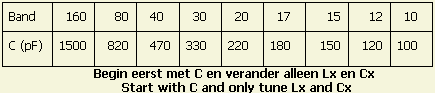 If you want to add or optimise a fixed input circuits for each band, it is best to use the C-values giving in the table. Starting with the fixed input value, experiment with Lx and Cx to get the lowest SWR. Replacing Cx with a piece of coax cable terminated with a variable capacitor (Ct) makes for and easy to reach adjustment. Be aware that the cable capacitance has to be added to the found optimum value of the trimmer at the end of the cable. This then becomes the value of the fixed capacitor, so Cx = Ct + Ccable. Finally eventually adjust C for improved SWR.
