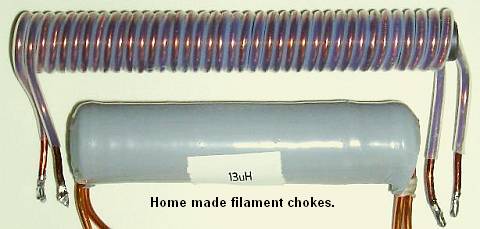 Although separate chokes can be used, the filament choke RFC1 has a bifilar winding (double solenoid) 1.8 mm diameter enamelled wire wound on a 10 cm long, 9.5 mm diameter ferrite rod from a broadcast AM radio. While the wire size might appear to be too thin for 14 A filament current, it serves also to provide a resistance to limit switch-on inrush current.