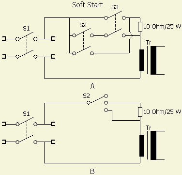 Simple soft start circuits to limit switch-on inrush current.