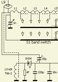 At the highest band, the tuning-C cannot be made small enough because of the high capacity of the anode circuit. It consists of the combined anode capacities of all valves, about 10–15 pF for the tuning capacitor's minimum and about 4–8 pF for stray capacity. At about 5 pF anode to grid capacity for one valve, our total minimum tuning capacity raises the loaded Q at 10 m and perhaps even at 15 m. This results in lower efficiency through higher circulating current losses and a lowered output at the antenna terminal. However, the situation is not that bad. We may consider the anode- and stray capacity as the C of a separate L-network in which the lead from anode clip to tuning-C acts as an inductance. We then see a combined L- and PI-network. Assuming that the anode lead is about 12 cm long (about 0.06 μH –> reactance = 12 Ω at 30 MHz), we may obtain (by the necessary parallel-to-series conversion) an equivalent driving-point impedance which may be about 30 % lower, and an associated shunt reactance which is also much lower. The net result of this analysis can be an explanation for the still reasonable circuit efficiency in the 10 m and 15 m bands. However the plate tank capacitor should be mounted as close to the tube as temperature considerations will permit, to make possible the shortest capacitive patch from plate to grid. Especially at the higher frequencies where minimum circuit capacitance becomes important, the capacitor should be mounted with its stator plates well spaced from the chassis, shielding or other metal parts.
