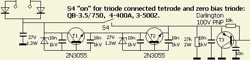 In this circuit all grid pins are at earth potential via a 2.2 Ω resistor. At the valve socket, all three grid-pins must be connected together (fig») with short connections of thick wire or ribbon strip (low inductance) and with the resistor, only one pin should be earthen to a common earthing point (chassis, print-board copper side). The grid is negatively biased with respect to the cathode through the forward voltage drop of the string transistors (e.g. power zener diodes), which positively biases the cathodes with respect to earth. In triode circuits, contrary to tetrode or penthode circuits, the bias voltage required for a given anode current greatly depends on the anode voltage: the higher the anode voltage, the higher the required negative grid bias and the higher the value of the two zener diodes.