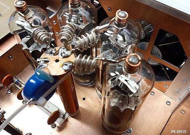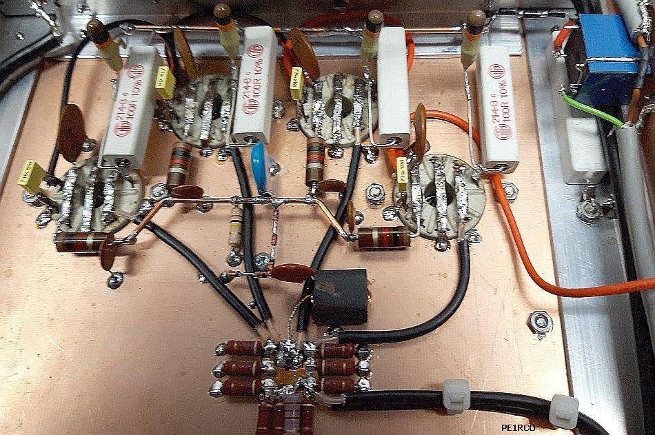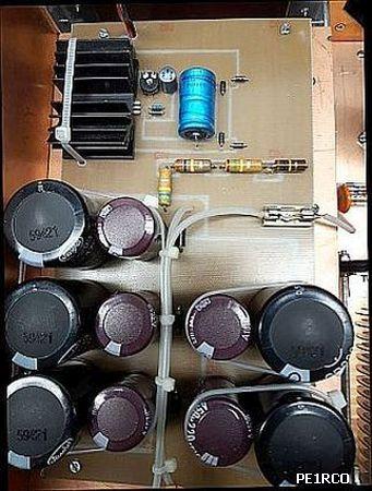 PE1RCO heeft ook en mooi stukje zelfbouw geproduceerd. De kast van printpaat is feitelijk net zo goed geworden alsof het van massief metaal gemaakt is. Gezien het aantal gebruikte schroeven voor de frontplaat, mag men aannemen dat het qua HF afscherming wel in orde is. Voor de zekerheid zijn er toch maar parasietstoppers aan de anode gemonteerd. Vanwege zijn slechte ervaring met 1300 V anodespanning, werd er spanningsverdrievoudiging met gelijkrichting toegepast. Dat kwam uit twee ringkerntrafo's van 230 ÷ 230 VAC onder de print met de afgebeelde elco's. Daarmee was het uitgangsvermogen 500 W op de 80 m band. De versterker is stabiel en bij het afstemmen gebeuren geen gekke dingen. Er is ook nog een aparte trafo voor de gloeispanning en de twee ventilatoren die gevoed worden via een LM317 stabilisator.