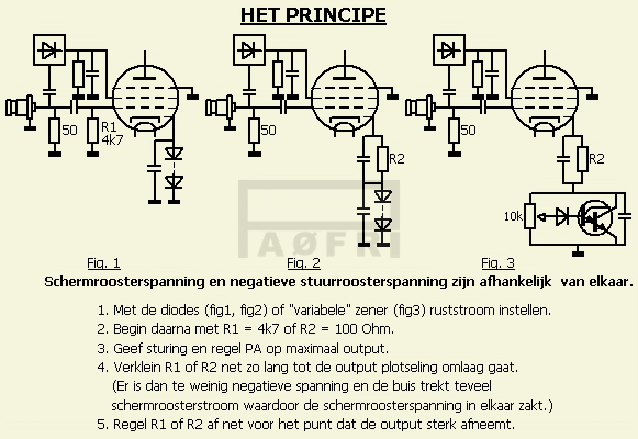 In dit artikel wordt het principe van figuur 2 («fig)toegepast. Zonder sturing van de zender wordt met een aantal diodes de ruststroom ingesteld. Door het signaal van een zender komt een wisselspanning op het stuurrooster, een verhoogde gelijkspanning op het schermrooster en door de kathodestroom een positieve spanning over de kathode weerstand. Dat laatste betekent dat er een negatieve spanning van het stuurrooster ten opzichte van massa ontstaat. Hoe meer sturing hoe meer alle spanningen toenemen en de buis open gaat. Heeft de kathode een te kleine weerstand dan vermindert de negatieve spanning van het stuurrooster, er loopt teveel schermrooster stroom en de (vermenigvuldigde) schermrooster spanning zakt in elkaar. Is de weerstand te groot, dan gaat de buis dicht bij een te hoge spanning over de weerstand.