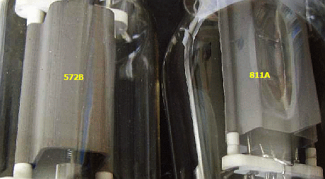 Er zijn HF versterkers in omloop met 3 × of 4 × 811A buizen. Dit type heeft een blikken anode met een anode dissipatie van 40 W en de maximum anodespanning in amateur zenders is ongeveer 1500 V. Inmiddels heb ik een aantal defecte exemplaren verzameld met verbogen anode of waarin zelfs gaten gebrand zijn. Alles het resultaat van landurige overbelasting of onvoldoende koeling in de PA's van vorige eigenaars. Op de foto (fig») is een oververhitting op het anodeblik duidelijk zichtbaar en inwendig is er een kortsluiting tussen anode en rooster. Veel beter maar wel duurder is een 572B met een anode van grafiet, een anode dissipatie van 160 W en in onze branche een maximum anodespanning van ongeveer 2700 V. Deze buis kan zonder enige wijziging van een versterker de originele 811A buizen vervangen. Als u graag heeft dat uw versterker lang en zonder problemen zijn werk doet, denk dan aan een omwisseling, zeker als het een type met 3 × 811A betreft. Overigens kan men dan kiezen voor 2 × 572B als vervanger voor de drie originele buizen. Heeft u een set met ingebouwde tuner, dan hoeft er niets aan de ingangscircuits van de versterker gedaan worden.