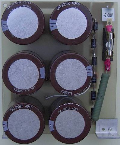 Parallel over de elco's staan weerstanden van gelijke waarde ter compensatie van de individuele lekstromen. Vroeger hadden zij een lage waarde (± 27 k?) om de hoogspanningsvoeding (als bleeder) extra te belasten. Het verschil in spanning tussen zenden en ontvangen werd daardoor kleiner; een vorm van "stabilisatie". Dat is niet nodig want als de PTT schakelaar ingedrukt wordt, zorgt de ruststroom van de buis voor de genoemde extra belasting. Tegenwoordig volstaat 100 k? per condensator. Neem daarvoor twee weerstanden 220 k?/2 W of drie weerstanden 330 k?/1 W parallel. Hiermee wordt het toekomstige effect van een verouderde weerstand verminderd. Bovendien is door het grotere oppervlak de koeling van een paar weerstanden parallel beter dan de warmteafgifte van één weerstand.
