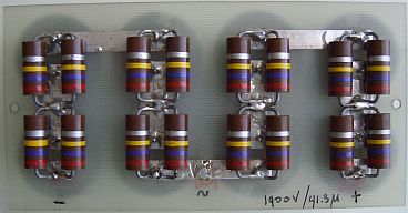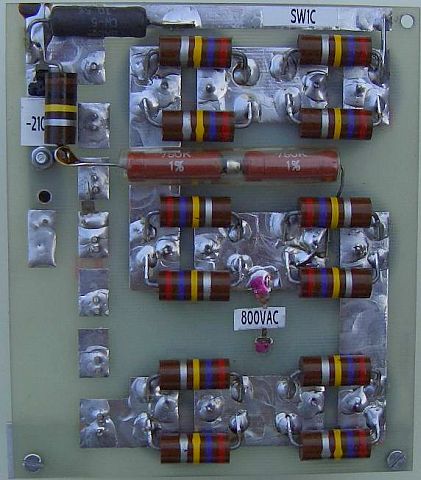 De weerstanden worden bij mij altijd in kanteelvorm aan de koperzijde van een printplaat gemonteerd en de elco's komen aan de andere kant. In dit voorbeeld werden vier rijen van twee condensatoren in serie gezet. Er werden in plaats van drie, twee weerstanden parallel over de elco's geplaatst omdat het 2 W types waren en de onbelaste spanning maar 1900 V= was.