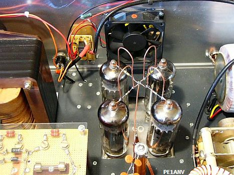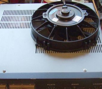 Veel versterkers die ik onderzocht, veranderd of gerepareerd heb, vertoonden verschijnselen van oververhitting, zoals geblakerde buisvoeten of anode smoorspoelen, gebarsten condensatoren en sterk verkleurde buizen. Allemaal het gevolg van te weinig koeling. Bij mijn experimenten om na te gaan hoever een buis overbelast kan worden, bleek dat onvoldoende koeling het eerst tot een defect leidde. Als u een vesterker voor een wand zet, zorg dan voor voldoende ventilatie door ten minste 15 cm afstand te bewaren ten opzichte van de wand. Wordt een versterker via de zijkanten geventileerd, neem dan ook een behoorlijke afstand in acht tot de apparaten ernaast. Gebruik een extra ventilator (fig») bij een contest, vooral als er ook nog een speech processor ingeschakeld is.