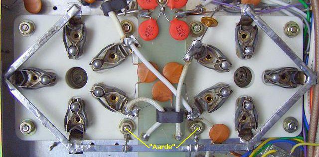 Inmiddels ben ik van mening dat wanneer de 3 pennen van een triode naar hetzelfde rooster in de buis gaan, het uitwendig met elkaar verbinden voor HF overbodig is. In de praktijk geldt de natuurwet van de minste weerstand of energie en een HF stroom zal de kortste weg kiezen. Het is dan maar de vraag of dat via alle drie pennen gaat. Door maar één aansluiting per buis aan massa te leggen, kan de stroom ook maar langs één punt lopen en dat bevordert de stabiliteit van een buis is mijn overtuiging. Op de foto's ziet u dat het idee door mij aangebracht werd in een TL-922. Verder werd van maar één buis een geïsoleerde draad van de desbetreffende pen getrokken naar het aardpunt van de tuning condensator VC1.