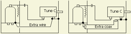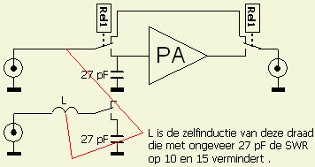 Vaak wordt de hoge SWR ook veroorzaakt doordat het circuit aan de ingang of de uitgang alleen gemonteerd is met draad en niet met 50 Ohm coaxkabel. In bij voorbeeld een Ameritron AL-811 is er alleen een draadverbinding tussen de loading condensator bij de frontplaat en het zend en ontvang relais aan de achterwand! Ook andere lange verbindingen van en naar relais gooien roet in het eten. Een condensator over het (fig») relaiscontact (of soms over de connector aan de ingang) "stemt" de draadverbinding breedbandig af in het 10–15 m gebied. Met een trimmer kan in dat bereik op een gunstiger SWR afgeregeld worden. Opnieuw bedraden met coaxkabel kan verbetering geven maar vaak blijft een extra condensator volgens de tekening nodig vanwege de bedrading van het relais zelf.