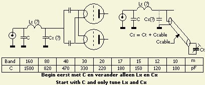 Als u een ingangscircuit wilt aanbrengen kunt u dat het eenvoudigste apart proberen. Zo'n pi filter kan u buiten de versterker testen door dat met een stukje coaxkabel (max 25 cm) te verbinden met de ingang van de buis. Het inbouwen van de filters doet u daarna samen met dat coaxkabeltje. De capaciteit van de kabel maakt deel uit van Cx. Als u het op een andere manier doet, bestaat er grote kans, vooral op 10 m, dat na het inbouwen de SWR niet goed meer is. Start in elke band met een vaste ingangscondensator C volgens de tabel en speel dan met Lx en Cx om een zo laag mogelijke SWR te verkrijgen. Als het niet lukt om SWR = 1 te bereiken wijzig dan in geringe matig C door verkleinen of vergroten en ga daarna weer verder met Lx en Cx. Elke verandering van het uitgangsfilter in de anode veroorzaakt ook een wijziging van de SWR aan de ingang. U moet ervoor zorgen dat de uitgang optimaal afgeregeld is met maximum key-down vermogen in een geschikte 50 ? dummy load. Is de SWR goed maar de roosterstroom te groot dan heeft de spoel van het uitgangsfilter een incorrecte zelfinductie.