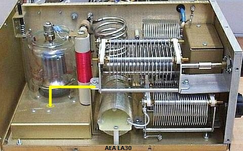 Deze versterker een AEA LA30 laat mijn idee in de praktijk zien. Het frame van de tuning condensator is mechanisch met het compartiment van de buisvoet verbonden maar HF stromen kunnen moeilijk naar "binnen" om het geaarde rooster te bereiken. Na een eenvoudige ingreep met een geïsoleerde draad door een gat in de bodemplaat, was de versterker stabieler en leverde ongeveer 20 % meer output op de 10 m band.