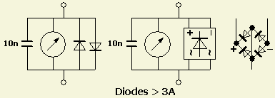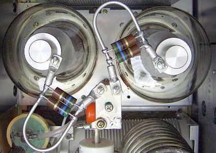 Verder is het verstandig om alle meters in de frontplaat te beschermen met antiparallel geschakelde diodes en voor HF te ontkoppelen met 10 - 22 nF. Het beste is om diodes te nemen die veel stroom kunnen verdragen. Als iets mis gaat met voeding of buizen loopt alle kortsluitstroom door een meter. (Is daar nog wel een identieke vervanger voor te verkrijgen?). Bruggelijkrichters zijn goed geschikt. Hiervan worden de wisselstroomaansluitingen met elkaar verbonden en dat moet ook met de (+) en (-) uitgangen. Zo ontstaan paren van anti parallel geschakelde (power)diodes.