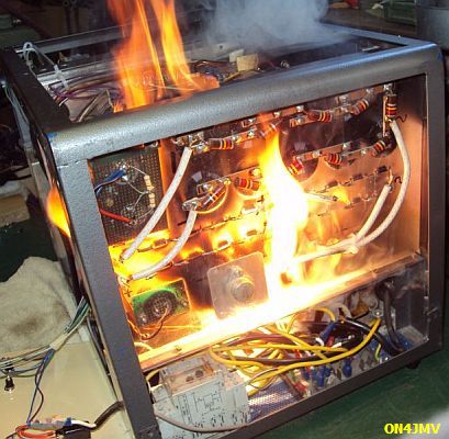 ON4JMV scrheef mij: "Ik was bijna klaar met een lineair met een GU-43B gebouwd volgens uw aanwijzingen, maar daar de buis al een hele tijd niet gebruikt was wilde ik deze ontgassen door deze een hele nacht te laten opstaan. Uiteraard met de gloeispanning, maar ook de hoogspanning trafo stond onder spanning. Dit was in een weekend van zaterdag op zondag. Zondag ging ik 'smorgens eens zien of het ding nog opstond maar er bleek in de zekeringkast een zekering gesprongen. Ik zet deze terug op en het ding startte terug normaal op, maar na enkele seconden hoorde ik een vreemd sterker wordend geronk, meteen had ik het door dat de hoogspanning trafo aan het doorbranden was. Er ontstond een lichte rook ontwikkeling en ik had toevallig mijn camera bij de hand en nam in een reflex een paar foto's, maar bij de derde foto stond het boeltje in de fik! En het ergste van al was dat de zekering nu niet uitvloog! Dus dit kon ook 'snachts gebeurd zijn met alle nare gevolgen van dien, met de brandweer erbij en zo.......