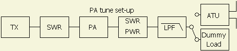 Kortom stem de anodekring altijd af op het volle vermogen in een 50 Ohm belasting. Een geschikte opzet waarbij veel in de gaten kunt houden, ziet u hiernaast. U hoeft het niet de doen, maar hier zit altijd een laag doorlaat filter (low pass filter) tussen de versterker en het antennesysteem.
