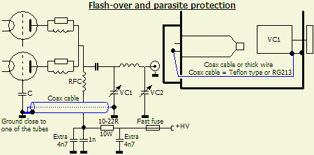 Om de buis daarvoor te beschermen adviseer ik om altijd een weerstand van 10 - 50 ? in serie met een snelle zekering te monteren in de verbinding (fig») tussen HV voeding en anodesmoorspoel. Breng ook de getekende extra 4.7 nF condensators aan om de ontkoppeling van een HF anodesmoorspoel op 80 en 160 m te verbeteren. Een geaard rooster versterker wil soms oscilleren omdat in en uitgang in fase zijn. Het beter aarden van loading (C-load) en tuning (C-tune) condensator door middel van een extra verbinding bevordert de stabiliteit van de versterker. Het werkt het ook goed tegen parasitaire oscillaties.
