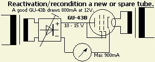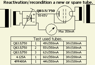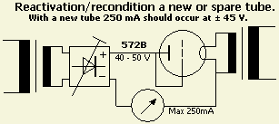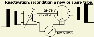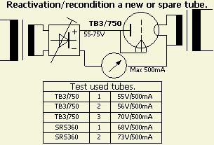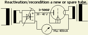 Bij onder ander een 3-500Z kan reactiveren betrekkelijk eenvoudig. Met een gelijkspanning van 30 à 40 V heeft men voldoende om de buis 400 mA te laten trekken als het rooster met de anode verbonden wordt. Laat de buis eerst een half uur aanstaan met alléén 4.9 V op de gloeidraad. Daarna komt de "hoogspanning" van ongeveer 35 V erop en regelt men dat af op een anodestroom van 400 mA. Meestal laat ik het reactiveren niet langer duren dan een uur of zo.