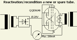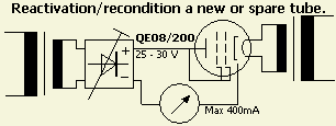 Een buis wordt niet gekoeld tenzij een fabrikant voorschrijft dat zijn product (b.v. keramische buis) gekoeld moet worden als de gloeidraad aan is. Als een buis nieuw of een lange tijd ongebruikt geweest is, dan zal de stroom geleidelijk oplopen zodat de spanning regelmatig lager gezet moet worden. Heeft de voeding een in te stellen stroombegrenzing dan hoeft u er niet steeds bij te blijven, maar heeft u dat niet, houdt dan de meter goed in de gaten. De anodestroom kan plotseling oplopen, een teken dat de buis "beter" wordt. Op een geven moment blijft de anodestroom stabiel bij een bepaalde spanning, bij voorbeeld 38 V/400 mA. Het reactiveren kan dan beëindigd worden. Als u eerst een betrouwbare buis in de schakeling probeert, ziet u bij welke minimale spanning dat plaats vindt en dan weet u of de te testen buis vergelijkbaar is met het goede exemplaar. Het reactiveren kunt u naar eigen inzicht verlengen, maar mijn ervaring is dat al na een paar uur (2 - 5) het proces gestopt kan worden. Een buis is meestal niet meer te redden als dan de behandeling verlengd wordt, maar het is het proberen waard.