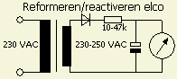 Van nieuwe en een lange tijd niet gebruikte condensatoren moet het elektrolyt gereformeerd worden. Sluit een losse elco via een 10 - 47 k? weerstand en HV diode (1N4007) aan op ongeveer ~250 V. Meet met een digitale voltmeter de gelijkspanning over de condensator en als dat niet meer stijgt is er voldoende gereformeerd. Ontlaadt de condensator met een 220 ? weerstand! Herhaal eventueel deze procedure een paar keer.