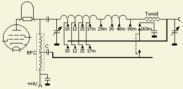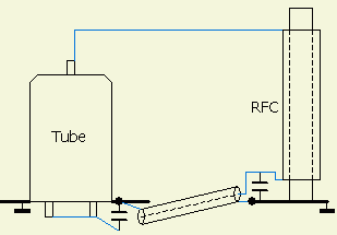 SM6AZZ vroeg mij waarom in een OM-Amplifier http://www.om-power.com/img/pi_and_tube_25hf.jpg een RFC zat met een middenaftakking. Dat was voor mij de eerste keer dat ik zoiets tegenkwam. Het lijkt mij een slim idee dat wel een extra segment van een bandschakelaar vergt. Omdat ik verder geen gegevens van de versterker bezit, filosofeerde ik er maar op los en werd het bovenstaande schema getekend. Kennelijk is voor de hogere banden de capaciteit van de wikkelingen onderling te groot of zijn er ongewenste dippen, zodat met de bandschakelaar een gedeelte kortgesloten wordt. De condensator C zorgt ervoor dat de bandschakelaar gescheiden is van de gelijkspanning.