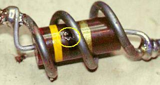 Als u onverhoopt parasietstoppers moet vervangen monteer dan het haarpin model volgens de foto. Na veel experimenteren en bouwen van HF versterkers is hier een "standaard" model ontstaan waarbij de lengte van de draad 10 cm is en de breedte van de haarpin 2.5 - 4 cm. Knip echter een stuk af van 12 cm en gebruik de extra lengte om de draad over de uiteinden van de weerstand te wikkelen en vast te solderen. Volgens AG6K moeten zij gemaakt worden van een speciale dure metaalsoort (NiCr), maar dat is niet nodig. Als u vertind draad gebruikt, heeft het oppervlakte een voldoende "skin" weerstand voor VHF dunkt mij.