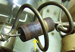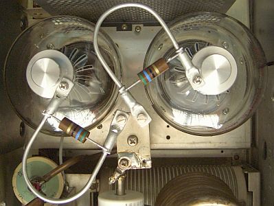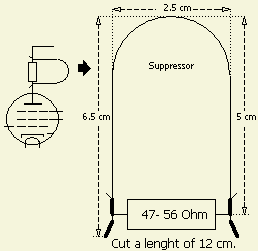 Bij sommige versterkers moest de haarpin vergroot worden om de buis of buizen stabiel te houden. In een TL-922A werd door mij blank vertind 6 mm² installatie draad (eventueel 2 mm diameter) gebruikt dat in deze toepassing de buizen net zo stevig op hun plaats houdt als de originele stoppers. U knipt een stuk van 12 cm en buigt dat om een pijp van 2.5 cm doorsnede en soldeer aan beide uiteinden een kabelschoen of soldeerlip. Er over nadenkend zou het mij niet verbazen dat door de montage van de weerstanden naast elkaar, de stoppers op twee brede frequentiebanden effectief zijn.