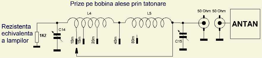 Wij begonnen in het midden tussen de twee spoelen en stelden de analysator in op 7.1 MHz en sloten de stekker aan op de 40 m tap, De twee variabele condensatoren werden verdraaid tot dat de ANTAN SWR = 1.0 aanwees. Dat was bij een half ingedraaide condensator (C15).