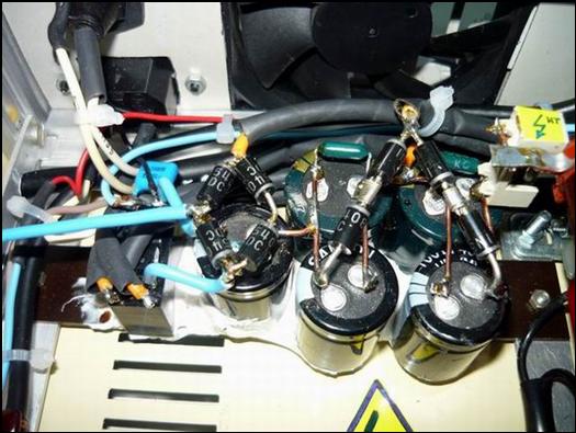 Bij de tweede trafo werd gelijkgericht en verdubbeld. Zo verkreeg ik 850 V.