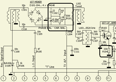 Omdat deze transceivers kennelijk met zo weinig mogelijk componenten ontworpen werden, zijn veel delen van de schakeling zowel voor zenden als ontvangen in gebruik. Dat is zeer economisch maar heeft het nadeel dat een verandering ook elders te merken is.