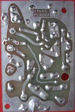 De instelling van de ruststroom in deze eindversterker heeft het nadeel dat het nogal temperatuurafhankelijk is. Vaak ook kunnen vele van dergelijke eenvoudige schakelingen niet de gewenste basisstroom leveren als de versterker volledig uitgestuurd wordt. Het gevolg is dat er een min of meer klasse C instelling ontstaat en zo'n PA niet meer lineair werkt. Een beter ontwerp dat gewoonlijk door mij gebruikt wordt is te zien in het artikel HF PA met VHF. Als dat stabilisatie systeem in de Atlas komt, moet er behoorlijk aan de originele printontwerp gesleuteld worden. Een andere schakeling afkomstig van G3YXM's site werd getest en deed het goed. Na bestudering van de PC-500 print bleek (fig») dat er een mogelijkheid was om zijn ontwerp aan te brengen zonder printsporen te veranderen of te beschadigen.