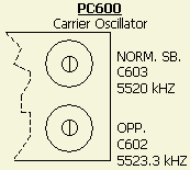 Volgens de handleiding zijn de draaggolf frequenties 5520 kHz en 5523.3 kHz; te trimmen met respectievelijk C603 (NORM. SB) en C602 (OPP.).