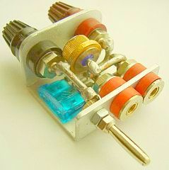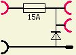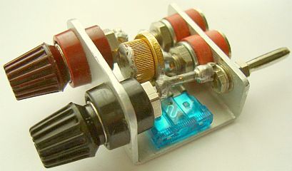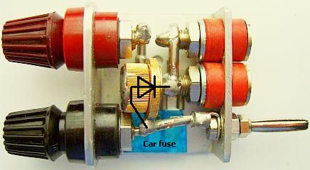 Op de foto ziet u een goudkleurige diode en een blauwe 15 A zekering. Deze combinatie is een bekende beveiliging voor het bij vergissing ompolen van een voedingsspanning. Als dat toch gebeurt loopt er een kortsluitstroom door de diode en de zekering piept door. Zo'n beveiliging lijkt overbodig maar tijdens experimenteren ben je gespannen en benieuwd naar het resultaat. Dan is een verkeerde handeling zo gedaan en ik spreek uit ervaring want hier is ook wel eens het zwarte stekkertje in een rood stekkerbusje etc. gestoken.