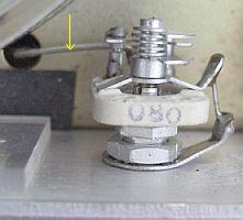 Bij het draaien aan de bandschakelaar kwamen («fig) in mijn set de hiernaast gemarkeerde draden tegen de afgevlakte as. Dat veroorzaakte een geringe verandering van capaciteit zodat bijna altijd de frequentie hoorbaar verschoven was als snel van de van de ene naar de andere band geschakeld werd. Verbuig de draden zodanig dat zij nimmer contact hebben met de as en de capaciteit daarmee sterk verkleind wordt.