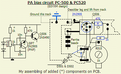 Met de bijgevoegde afbeeldingen zal het voor de meeste nabouwers geen probleem zijn om de modificatie aan te brengen. Voor de duidelijkheid zijn twee ontkoppelcondensatoren (10 nF) in het montageplan en op de foto weggelaten. Meestal is bij het opwarmen van de eindtorren een nog betere stabilisatie te bereiken door voor een goed thermisch contact de diodes (D501 en D502) op Q504 en Q505 te monteren. Breng koelpasta aan voor een optimale overdracht van de warmte. Omdat met G3YXM's schakeling de ruststroom verrassend stabiel bleef bij het warm worden van het koelblok, werden de diodes niet verplaatst. Het vermoeden bestaat dat er een temperatuur stabiliserende werking ontstaan is door het omgekeerd monteren van de PNP transistor op de originele regeltransistor Q506. De laatste volgt via het koelblok de temperatuurveranderingen van beide eindtransistors. Met deze stabilisatie schakeling is de ruststroom ook beter op een gewenst niveau in te stellen.