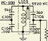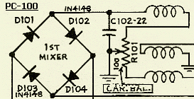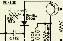 Een («fig) Atlas modificatie op PC-100 was een 100 Ohm (R101) regelweerstand vervangen door een 500 Ohm type met parallel eraan twee in serie geschakelde 68 Ohm weerstanden. Meestal is dat niet in het schema terug te vinden, maar werd het wel op PC-100… printen aangebracht. De wijziging was voor een verbetering van de draaggolf balans. Het is aan te raden om deze modificatie op oudere PC-100 printen aan te berengen. Vervang eventueel R104 door een 1 kΩ trimweerstand. In latere versies van PC-100 blijkt dat een vaste weerstand van 330 Ω kennelijk toch een juiste keus was, zodat u waarschijnlijk geen trimpot hoeft te plaatsen. Bij sommige PC-100… printen versterkte de 1ST I.F. AMP (2N3866) teveel en dan moest de 330 Ohm weerstand vergroot worden.