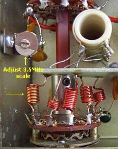 De schaalverdeling klopt behoorlijk goed met de werkelijke frequentie als u experimenteert met de montage van de trommelschaal op de as. Het gaat om het rode streepje op de frontplaat ten opzichte van de nul op de schaal. Voorbeeld: bij de ene set moet dat precies lijnen en bij een ander klopt het wanner het rode streepje meer of minder links van de nul komt te liggen. Het zal duidelijk zijn dat daarna de schaal geijkt moet worden door aan de kerntjes van de VFO te draaien.
