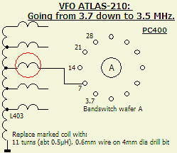 Mijn Atlas-210 uit de USA was kennelijk niet voor Europa bestemd want de 80 m band loopt van 3.7 - 4.05 MHz. De schaal gaat van 0 - 350 zodat het 10 m bereik 28.4 - 29.1 MHz is bij 15 m maar tot 21.350 MHz. Met de laatste twee beperkingen kan men leven, maar het 80 m bereik is niet voldoende voor huidige frequentiegebied. De bandcorrectie trimmer op 80 m kon het bandsegment slechts maximaal 50 kHz opschuiven. Na enige probeersels met extra parallelcapaciteit bleek dat voor een correcte schaalaanwijzing er beter met zelfinductie geëxperimenteerd kon worden. Het eindresultaat (fig») ziet u hiernaast. Van de bandschakelaar werd het oorspronkelijke spoeltje naar print PC400 (VFO) vervangen door een (~ 0.5 µH) spoel met 11 windingen van 0.6 mm draad dat eerst gewikkeld werd op een 4 mm boortje. Het spoeltje wordt gemonteerd aan de derde aftakking gerekend van de top van L403. De ingangskringen van de ontvanger (PC900) moeten opnieuw in het midden van de band (3.650 MHz) afgeregeld worden.