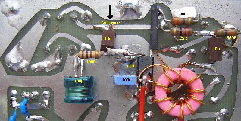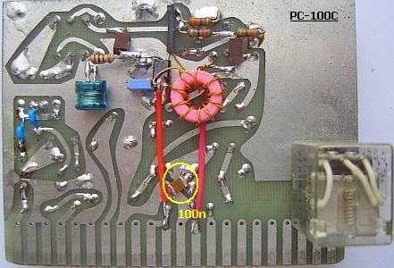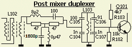 De koppeling met de volgende afgestemde kring (L103) wordt niet gedaan met een ringkern breedband systeem, maar met een 10 pF condensator aan de top van L103. Zowel de post mixer versterker als de afgestemde kring worden minder belast en is er een scherpere resonantie. Daarmee komt het knooppunt van de capacitieve spanningdeler C104/C105 te vervallen. De kring moet na het aanbrengen van de modificatie opnieuw afgeregeld worden.