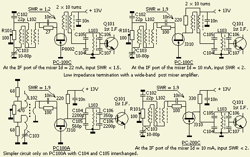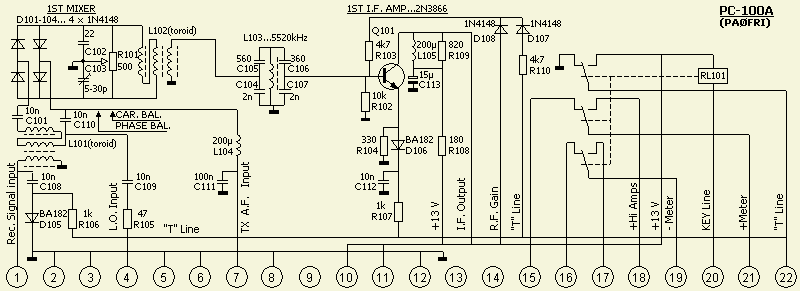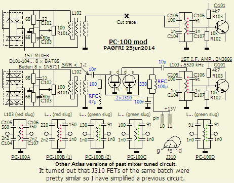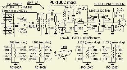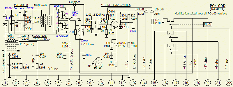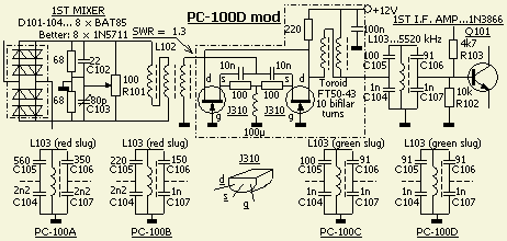 Het is gedaan met een FET in geaarde gate schakeling. Het is toepasbaar voor alle PC-100A t/m PC-100D printen. De afgestemde kring (L103) heeft in manuals niet hetzelfde nummer. Ook de kerntjes en condensators zijn per printtype anders en dat is in bovenstaand schema als extra informatie ingetekend. De gegevens heb ik overgenomen van de in mijn bezit zijnde originele PC-100 printen.