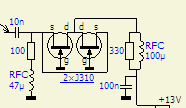 Omdat hier beschikking is over PC-100A, PC-100B, PC-100C en PC-100D kon ik het niet laten om mijn drift tot experimenteren nog eens los te laten op print PC-100D in mijn Atlas215x. In het verleden werd hier al eens geknutseld met meerdere J310 parallel om de "absolete" P8000 en P8002 te vervangen. Het doel was om de uitgang van L102 zo goed mogelijk met 50 Ohm te belasten en niet teveel versterking in de bestaande schakeling te introduceren. Met nevenstaande schakeling is dat redelijk goed gelukt en de uitgang van L102 ziet over een breed gebied een belasting van 50 Ohm met een SWR = 1.3. Het een en ander werd gemeten met twee verschillende antenne analysators.