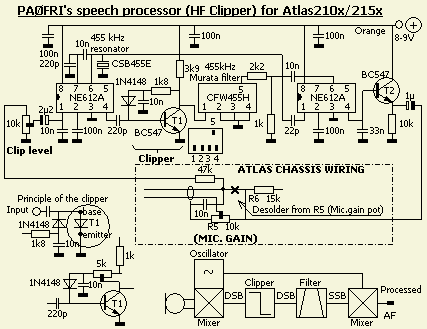 De DSB begrenzer in mijn oorspronkelijke Atlas artikel had problemen bij sommige buitenlandse nabouwers. Waarschijnlijk door het gebruik van een ander type IC (b.v. TBA120S, TBA120AS, TBA120T, TBA120U) dan het eerdere model TBA120 (TBA120A) hetwelk in mijn schakeling toegepast werd. Bovendien zijn de oudere types steeds moeilijker te verkrijgen. Reden waarom ik ben gaan experimenteren met de goed beschikbare NE612A of SA12AN, zie ook DSB clipper. De onderstaande eenvoudige versie van een speech clipper, een van mijn vele geteste bedenksels, werkt zo goed dat het ook in mijn SWAN100MX en Ten Tec Corsair II sets komt.